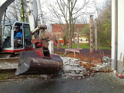 Für die Dauer der Arbeiten wurde dazu in Absprache mit Gemeinde und Dorferneuerung das Baumhaus des Spielplatzes vorübergehend entfernt und dieses wird im Anschluss wieder passend eingebunden.