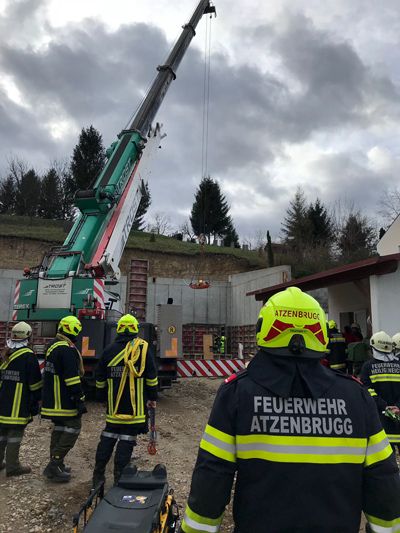 Der Verunfallte wurde von den Feuerwehren mittels Korbtrage und des vor Ort befindlichen Mobilkrans aus dem unwegsamen Gelände hinter der Schalung gerettet und konnte anschließend dem Rettungsdienst zur weiteren Betreuung übergeben werden.