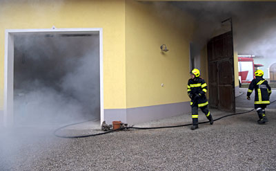 Schon während der Anfahrt nach Weinzierl rüstete sich der Atemschutztrupp aus und die Wärmebildkamera wurde vorbereitet. Am Einsatzort - ein landwirtschaftlicher bzw. Weinbau- und Heurigenbetrieb - drang dichter Rauch aus dem Selchkamin. Der Raum um die Selchanlage - geschützt durch eine Brandschutztür - stand bereits in Flammen.