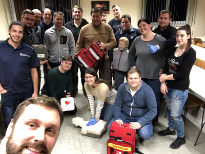 Dazu erläuterten die Erste-Hilfe Profis den genauen Ablauf der aktuellen Vorgangsweise mit 30 x Herzdruckmassage und 2 x Beatmung. Ebenso wurde der Einsatz des Defibrillators geschult.