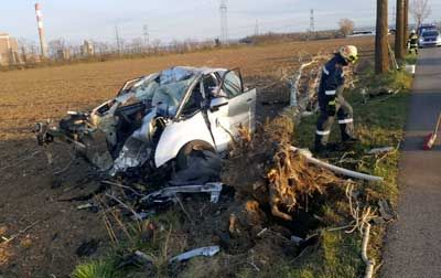 Vor Ort war ein PKW frontal gegen einen Baum geprallt, der dabei komplett umgerissen wurde und durch den Aufprall war das Fahrzeug völlig zerstört.