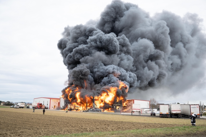 Beim Eintreffen der Einsatzkräfte stand auf einem großflächigen Firmenareal eine Lagerhalle in Vollbrand. Durch das enorme Brandgeschehen und die hohe Brandlast konnte ein Übergreifen des Feuers auf zwei weitere Hallen nicht mehr verhindert werden.